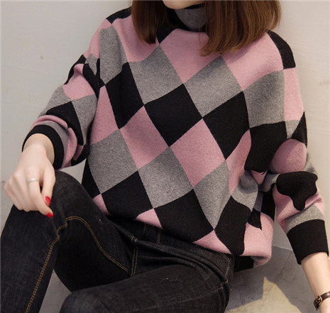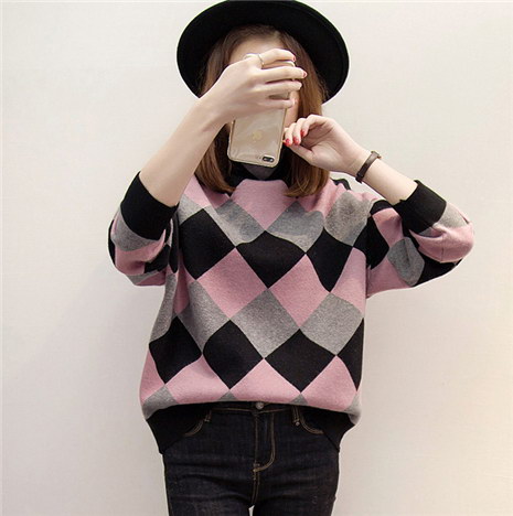 秋冬打底衫长袖拼色菱形格针织衫